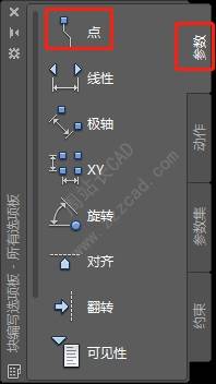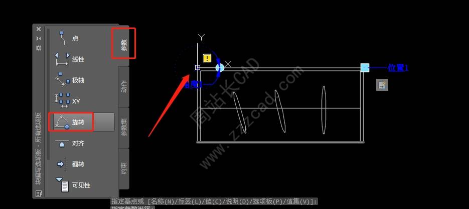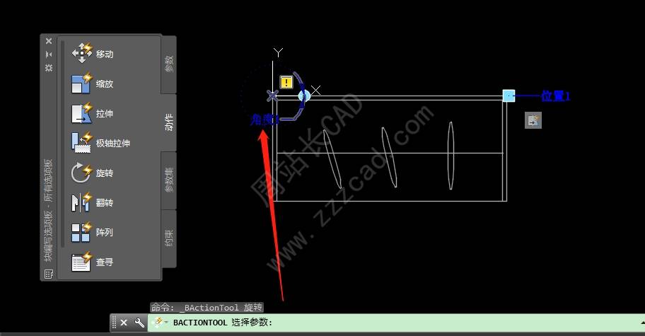 在块编写选项板上,单击动作,单击旋转,根据命令行提示,选择刚才创建的参数。