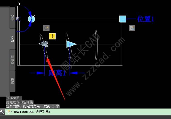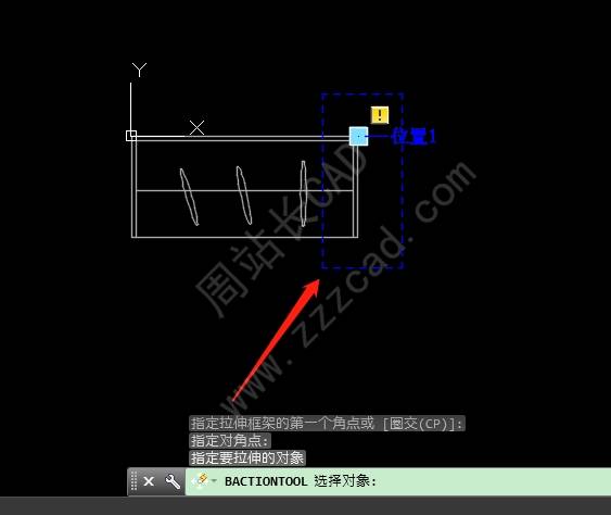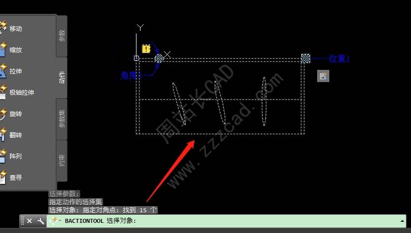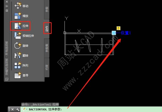 在块编写选项板上,单击动作,单击拉伸,根据命令行提示,选择刚才创建的参数。