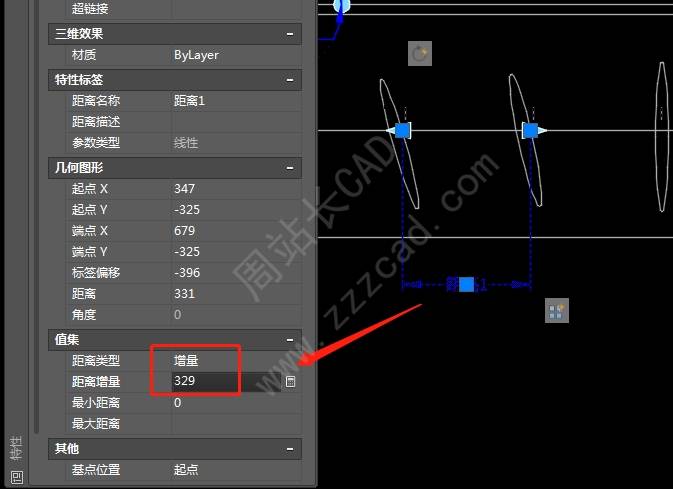 为了使得拉伸时,衣柜里的衣架随之均匀出现,所以选中阵列参数,在特性窗口中,设置阵列增量。