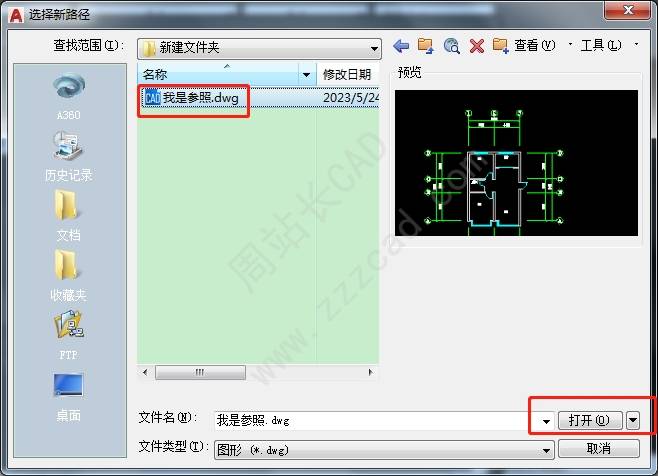 随即弹出浏览窗口,在浏览窗口中,重新选择一次参照文件。选中参照文件,单击打开。