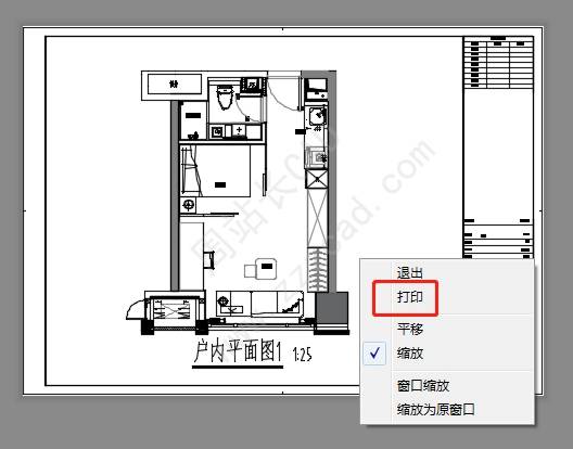 如此得到想要的打印效果后,在预览图纸上,单击鼠标右键,在弹出的级联菜单中,单击打印即可。