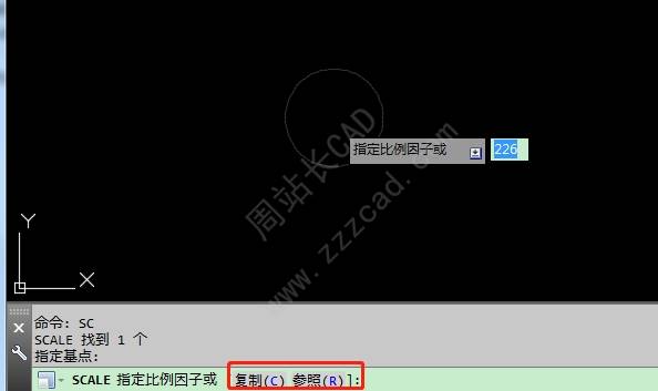 选中对象,命令行输入sc缩放命令。命令行提示指定基点,单击屏幕指定对象的缩放基点后,随之,命令行会出现一个选择项,输入复制之后的字母c。