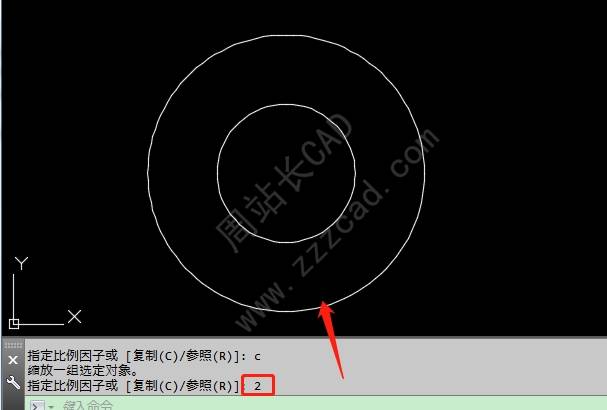 然后,根据命令行提示,输入缩放比例因子。此处输入2。随之,便可以得到一个源对象,一个缩放了2倍的对象。