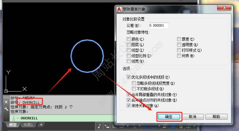 命令行输入overkill,然后选择要进行操作的对象,随之,会弹出删除重复对象对话框,单击对话框中的确定。