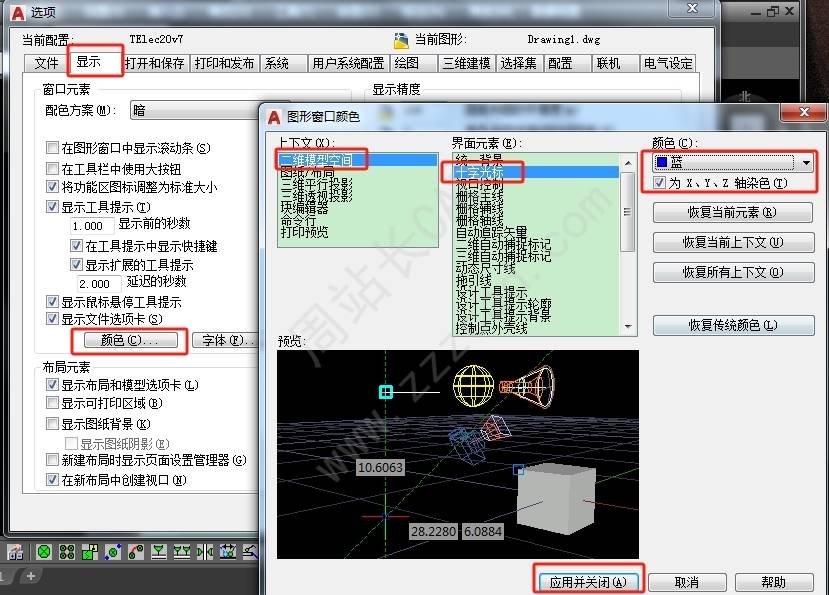 命令行输入op,在弹出的窗口中,单击绘图选项卡,单击颜色面板,在随即弹出的窗口中,选择二维空间,选择十字光标,勾选“为xyz轴染色”,选择一个颜色。