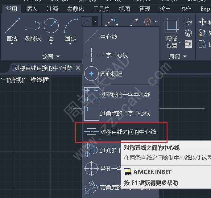 点击绘图功能区对称直线之间的中心线命令;