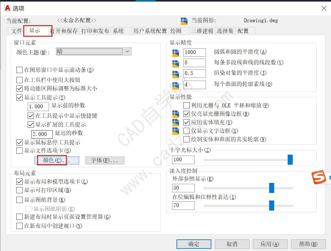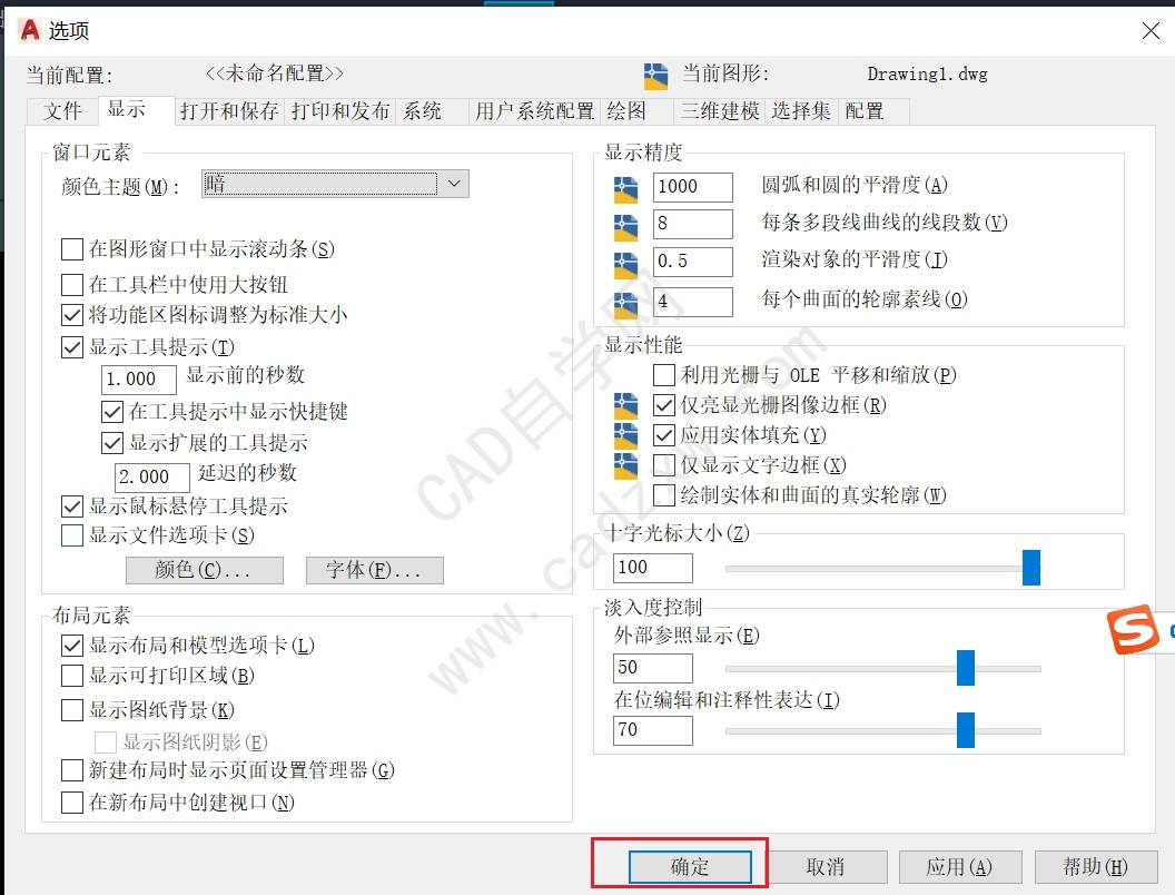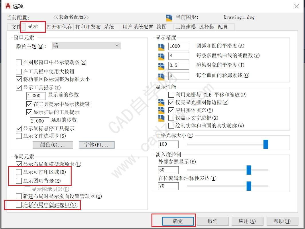 点击显示,将布局元素中的显示可打印区域、显示图纸背景、在新布局中创建视口前的勾去掉,点击确定;