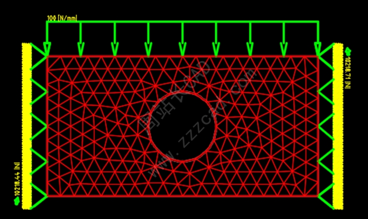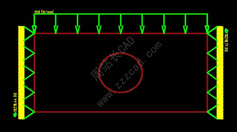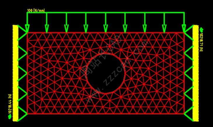 步骤二:接下来选择载荷及支承,在平板两端施加固定约束,上段施加均布载荷,竖直大小为100N/mm,如下图所示;