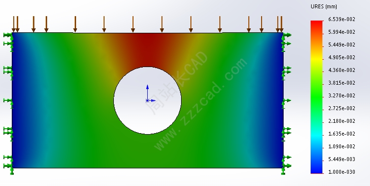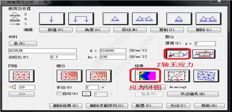 步骤五:本文计算平面应力,及允许Z轴变形,无Z轴应力,因此按图纸所示选择左侧按钮,然后点击应力云图,输出Von mises应力及位移。如图6所示;