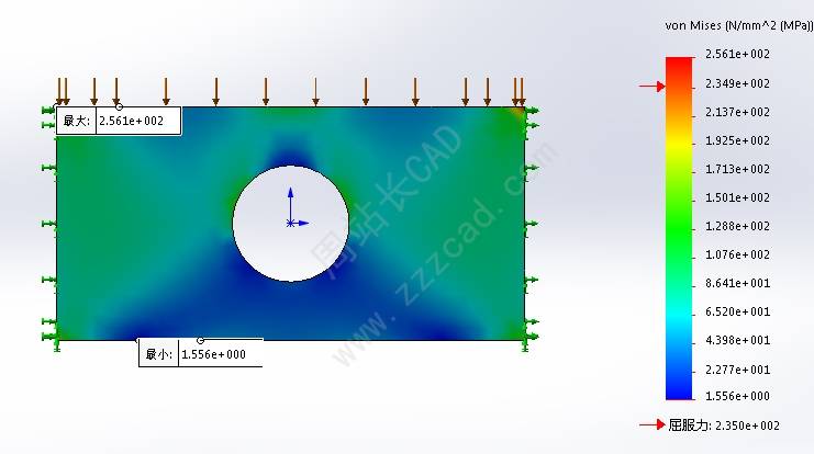 通过Solidworks simulation 对平板进行静力学分析,以对CAD Mechanical计算结果进行验证,其结果如图8所示,最大应力为256MPa,最大位移为0.065mm,与CAD Mechanical 有限元分析结果近似。其结果差异可能在于网格的精度及软件计算算法的精度。