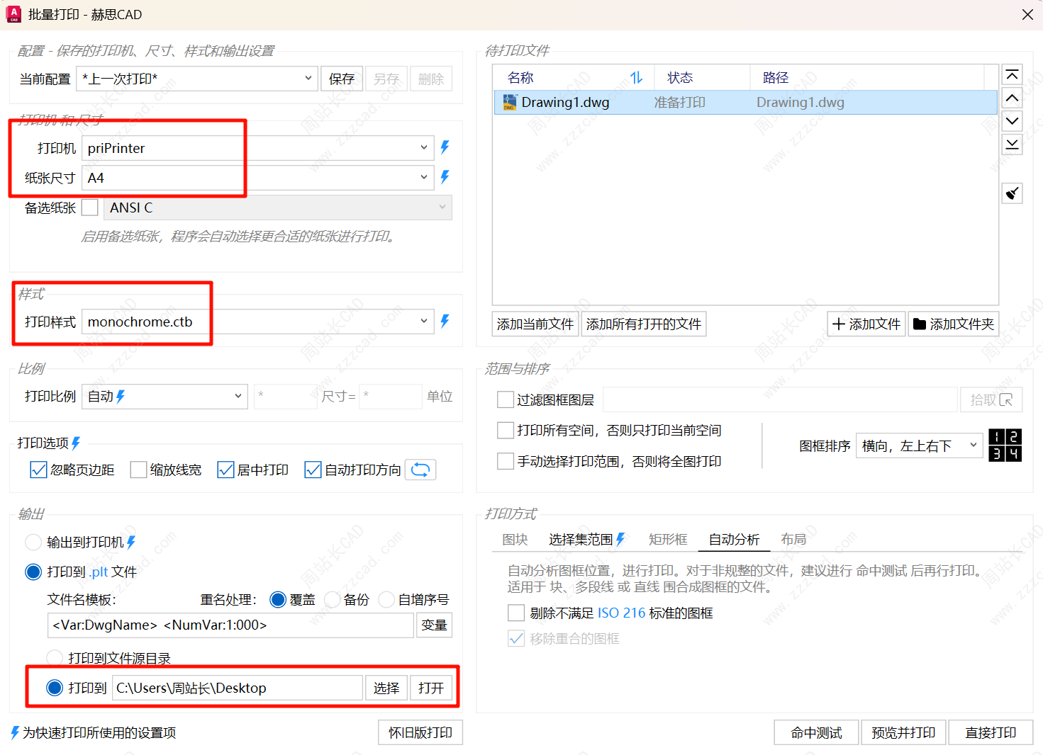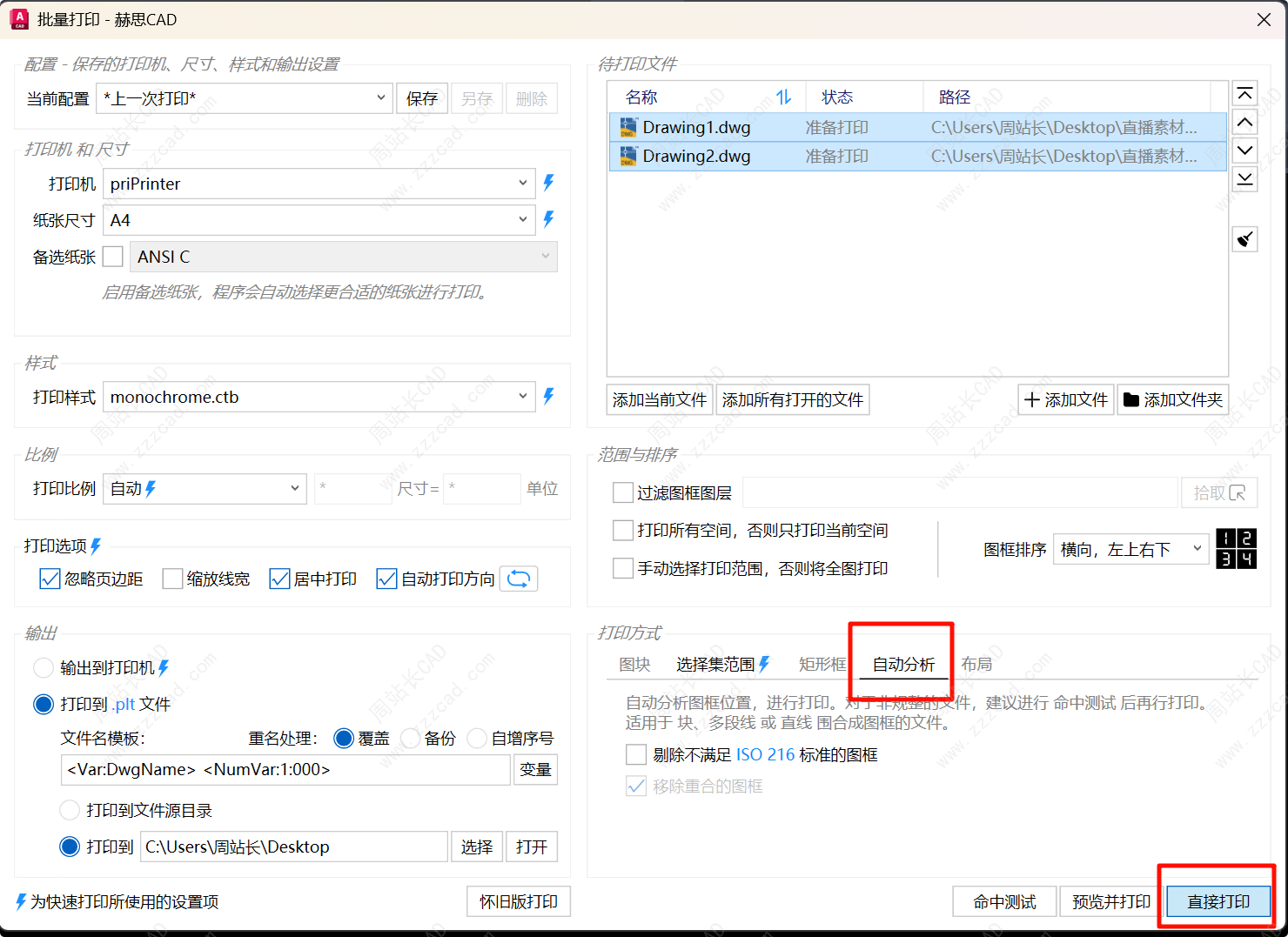 选择自动分析、直接打印。