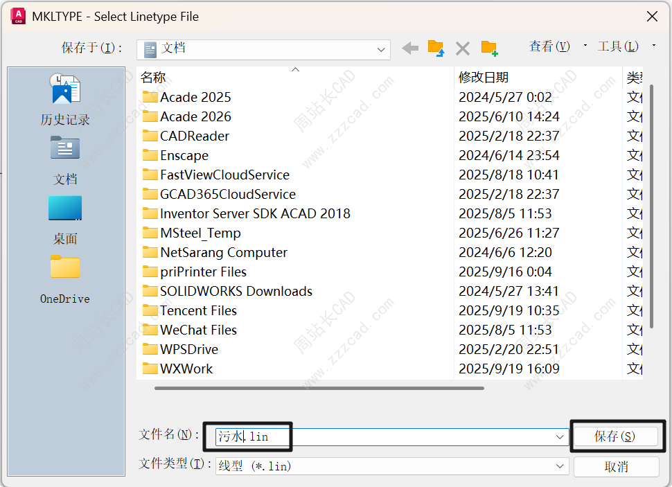 弹出选择线型文件对话框,给线型命名,点击保存。