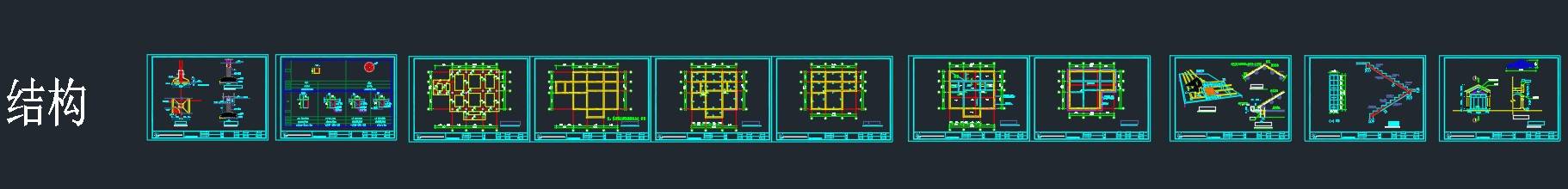 结 构 图:基础基点图、钢筋截面图、基础垫层布置图、基础梁布置图、二层梁布置图、屋顶梁布置图、二层板配筋图、屋顶板配筋图、屋顶结构透视图、屋顶结构图、天沟大样图、楼梯配筋图。门楼剖面图。